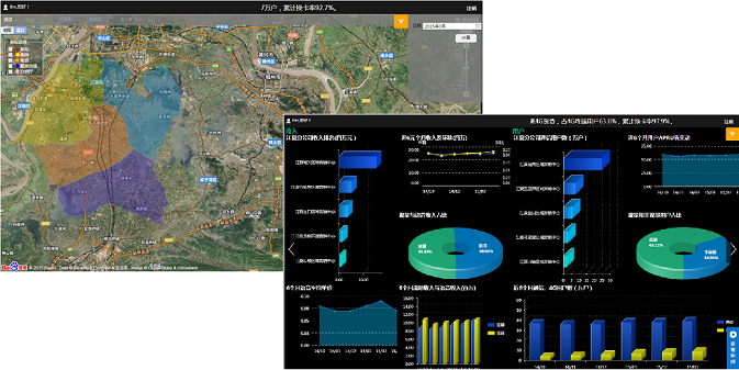 實時集中監(jiān)控平臺以簡潔、美觀的圖表頁面,集中展現(xiàn)企業(yè)各環(huán)節(jié)經(jīng)營數(shù)據(jù)。武漢移動經(jīng)過多年信息化的建設(shè),已形成區(qū)域化的業(yè)務管理體系,并積累了大量的業(yè)務數(shù)據(jù)。為清晰呈現(xiàn)各項指標在全市范圍內(nèi)不同區(qū)域的整體情況,億信BI通過在GIS地圖上對各區(qū)域模塊進行顏色渲染,清晰展示企業(yè)業(yè)務區(qū)域的分布情況(如下圖左側(cè)所示),同時通過多TAB頁的展示方式(如下圖右側(cè)所示),以專題化(包括收入,用戶發(fā)展、4G發(fā)展等專題)的頁面,分析了各主題中不同項經(jīng)營指標的排名,占比,趨勢以及對比情況,從而使決策者可快速定位自己所關(guān)心的重點數(shù)據(jù)。