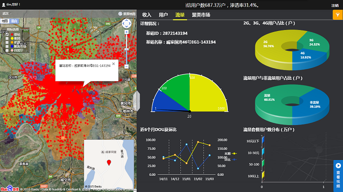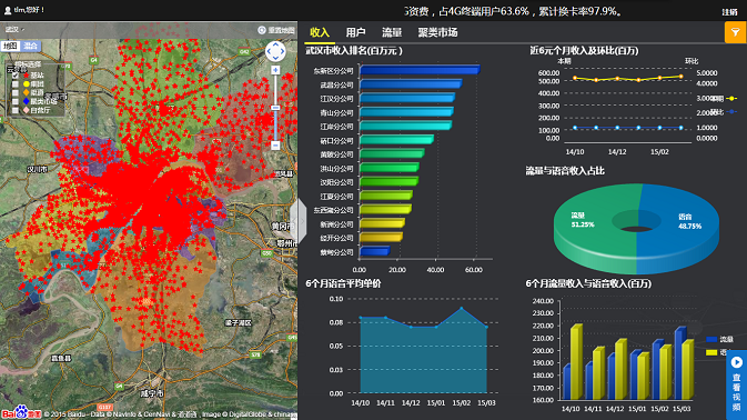 基于GIS地圖的沙盤式管理理念,依托于百度地圖的地理信息,結(jié)合武漢移動已有的業(yè)務數(shù)據(jù),億信BI實現(xiàn)了對武漢移動各區(qū)域市場、企業(yè)客戶、渠道網(wǎng)點的集中管理和實時監(jiān)控,真正實現(xiàn)了企業(yè)的沙盤式管理思想。
