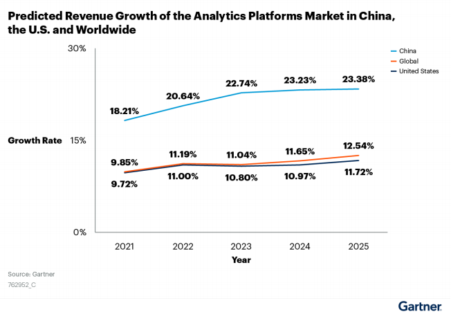 近日,國際權威研究與咨詢機構Gartner發布2022年《中國分析平臺市場指南》(《Market Guide for Analytics Platforms, China》)。億信華辰入選“代表性廠商”,億信ABI作為代表性產品上榜。 01、藍海已現中國分析平臺市場高速增長可期 此次發布的《中國分析平臺市場指南》中,Gartner從市場趨勢、競爭格局、產品方向等多個維度對中國的數據分析市場做了分析和預測。 報告指出:中國分析平臺市場規模將持續增長。在數字化轉型趨勢、自助服務、增強分析以及商業智能解決方案的推動下,到2023年,整體分析采用率將從35%增加到50%。預計到2025年,中國分析平臺市場規模將達到16億美元,市場增長率將由18.21%提升到23.38%,是全球(12.54%)和美國(11.72%)市場預期增長的兩倍左右。 在《指南》中,Gartner對數據分析平臺的能力做了進一步的定義,包括了:企業報告平臺、ABI平臺、AI和數據科學平臺、ABI定制化應用和位置智能平臺等方向。而在這些細分市場中,增長最快的領域是ABI平臺、AI和數據科學平臺,預計復合年增長率分別為36.23%和27.72%。 《指南》指出,傳統的企業報告解決方案通常依賴IT團隊,從成本投入和效率上都難以滿足當前企業建設的需求。隨著低代碼/無代碼和人工智能/機器學習功能等先進技術的發展以及應用,自助式的分析平臺將更受歡迎,它的應用能讓企業從業務導向&特定領域的深度洞察中受益。 02、匠心打造億信ABI立于行業發展潮頭 億信ABI是億信華辰歷經十多年匠心打造的國產化BI工具,是一站式智能數據處理分析平臺,精準契合中國分析平臺市場發展需求與趨勢。 它打通從數據接入、到數據建模與處理、再到數據分析與挖掘、數據可視化整個數據應用全鏈路,可滿足企業經營中各類復雜的分析需求,實現多維度的數據分析應用,讓數據發揮價值,驅動業務運營,幫助企業實現高效數字化轉型。 億信ABI覆蓋數據分析完整流程 作為國內首家有ABI聯合思維并在產品名中使用“ABI”的公司,我們用專業能力定義行業標準,并持續打造行業標桿客戶,引領行業發展新風向,更賦予了適用于中國本地化數字化轉型的“3A”指導策略,即: AII in BI:一站式應用型BI。產品功能全面,打通數據應用全流程,實現數據填報、處理、分析一體化。一個產品平臺即可為政企用戶提供從數據準備,ETL數據處理、數據建模、數據可視化、數據分析、數據填報、移動應用等一系列功能。 Analytics:增強分析型BI。全方位強化分析能力,提供挖掘預測分析、大數據量分析。同時支持鉆取、領導駕駛艙、3D可視化、大屏分析、報告分析、等多種分析方式。用戶不需要太多專業的數據處理知識、統計學知識、算法知識就可以低門檻的獲得更多、更全、更準確、更深入的數據分析結果,洞察數據關聯,實現數據挖掘,輔助決策支持。 AI+BI:智能化的BI。以人工智能分析為引領,為企業運營管理所有環節提供分析洞察。作為國內老牌BI廠商,億信華辰潛心專研,將AI技術融入BI產品,開創性提出“智問”,“智讀”、“智算”等功能,從而實現“BI產品智能化的服務,更智能的BI產品應用”,引領國內BI工具的方向與趨勢。 03、專業之選助力政企釋放數據價值 億信華辰作為中國專業的商業智能BI和數據治理軟件提供商,一直致力于為政企用戶提供從數據采集、存儲、治理、分析到智能應用的智能數據全生命周期管理方案,幫助企業實現數據驅動、數據智能,已積累了11000+家用戶的服務和客戶成功經驗,為客戶提供數據分析平臺、數據治理系統搭建等專業的產品咨詢、實施和技術支持服務。 億信華辰始終堅持自主研發和國產化路線,積極推動產品與基礎軟硬件的兼容適配。旗下產品億信ABI已經完成與國內主流芯片、操作系統、數據庫、中間件等上百家產品的適配工作,完全兼容、性能穩定是共同的結論。  未來,億信華辰將繼續在智能數據領域進行探索和實踐,以創新為驅動力,不斷為用戶提供更好用的軟件產品和全面深入的優質服務,推動企業和政府的數字化智能化轉型。