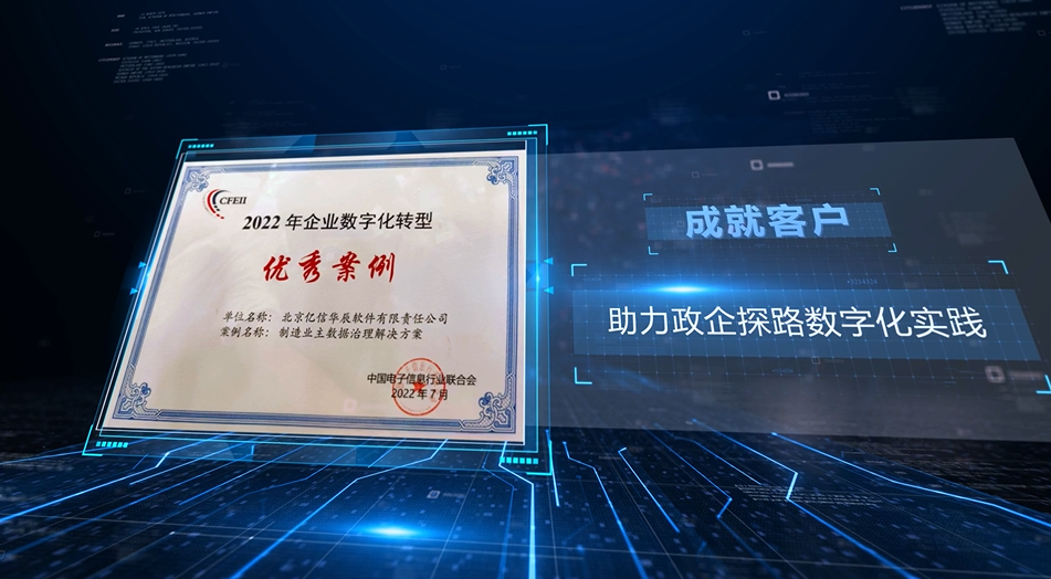 在工信部和廣東省人民政府聯(lián)合主辦的2022中國數(shù)字經(jīng)濟創(chuàng)新發(fā)展大會的“企業(yè)數(shù)字化轉(zhuǎn)型引領(lǐng)制造業(yè)高質(zhì)量發(fā)展論壇"上,億信華辰制造業(yè)主數(shù)據(jù)管理解決方案被評為2022年企業(yè)數(shù)字化轉(zhuǎn)型優(yōu)秀案例。