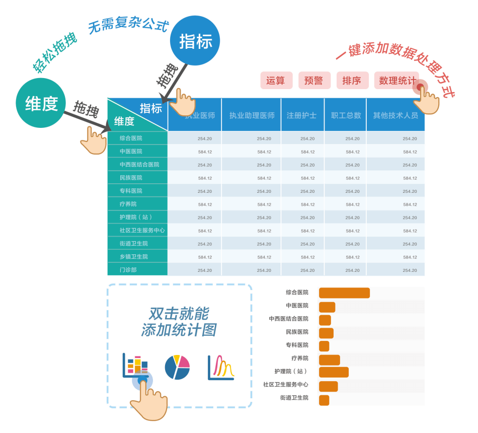 完全面向業(yè)務(wù)人員,充分理解當(dāng)下業(yè)務(wù)人員渴求自主探索數(shù)據(jù)的心情,只需要簡(jiǎn)單的鼠標(biāo)拖拽維度和指標(biāo),即可快速生成圖表。點(diǎn)選式數(shù)據(jù)預(yù)處理,智能的圖表推薦,全程無需編寫表達(dá)式,零學(xué)習(xí)成本,一分鐘上手。敏捷看板中不僅內(nèi)置多種數(shù)據(jù)統(tǒng)計(jì)函數(shù),如:求和,最大值,排名,同比、環(huán)比、上期等,而且支持自定義維度和指標(biāo),兩者可以一鍵切換,靈活簡(jiǎn)便的分析方式,方便用戶進(jìn)行猜想式、求證式的數(shù)據(jù)探索。