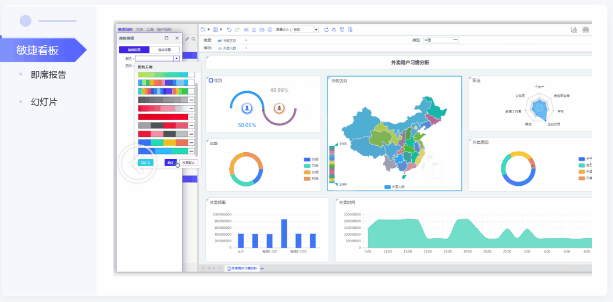 隨著互聯網思維的深化,如市場、財務、銷售、運營等越來越多的崗位,都開始重視并自發性的開始了解并學習數據分析,來引導幫助決策。真正的數據分析,應該完全面向業務,響應業務人員各種腦洞大開的思路,任由其隨心所欲探索數據價值。例如,運營制定用戶活躍度模型,監控用戶的成長以及復購和轉化,以至精細化營銷;人力資源制定效能儀表盤,去實時掌握人員狀況和人均效能,通過對招聘漏斗的分析促進招聘效果提升。 一、什么是數據看板? 數據看板允許用戶與數據進行交互,使他們能夠做出數據驅動的業務決策。同時,可以用來追蹤、分析、監控和直觀展示關鍵業務指標,是公司數據驅動的重要工具。公司通過看板監測核心數據、及時洞察業務問題、溝通各部門落地解決方案成為常態。 二、數據BI看板的優勢 1、敏捷決策 數據BI看板只需點擊幾下鼠標,就可以從不同的視角查看數據。放大、縮小、篩選要素、選擇時間間隔、顯示或隱藏不需要的特定參數。能夠以前所未有的方式查看數據,幫助決策者使用企業最新的數據來做分析。 2、實時監控 業務發展速度對于任何想要在殘酷的數字時代生存下去的公司來說,是至關重要的因素。使用傳統的Excel或PPT時,數據每更新一次都必須要手動更新報告。而商業智能的核心在于,數據BI看板可以支持實時數據。 3、提高效率 隨著互聯網發展速度越來越快,收集并需要分析的數據量在不斷增長。雖然靜態報告已成為可靠的工作助手,但使用Excel的處理大量數據依舊顯得很吃力。而使用數據BI看板,不僅可以更迅速地處理數據,還能提高生產力。 4、節省資源 因為對數據庫查詢或自定義的需求數量大大減少,不僅IT部門能夠專注于其他更緊迫或有價值的任務,而業務人員也可以快速獲得問題的答案。讓用戶自主執行數據分析,可以幫助公司節省寶貴的IT資源。 三、如何搭建數據BI看板 本文給大家介紹一款國內簡單又好用的數據分析產品-億信ABI。它億信華辰自主研發的一站式數據分析平臺。它提供了從數據導入、數據預處理、自動建模和數據可視化分析于一體的完整的解決方案。業務人員可以僅僅通過拖拽幾下鼠標便完成基本數據查詢到數據可視化的流程。 靈活的數據預處理 對于接入系統的數據,通過點選式的方式進行去除重復行、空值替換、數據裁剪、數據脫敏、類型轉換等復雜的數據處理操作,并且能進行圖形化界面多表關聯。 百億數據秒級響應 支持基于列存儲的MPP架構的分布式數據庫進行敏捷分析,百億數據可達到秒級響應,給用戶帶來極致的產品體驗,可解決TB甚至PB級超大數據量敏捷分析的難題。 豐富的可視化展示 支持敏捷看板,即席報告,幻燈片等多種分析方式,使數據分析更貼近用戶應用的場景。并且提供多種可視化組件:表格、常規統計圖、html5統計圖、地圖等。 分分鐘制作敏捷看板 支持靈活的自由式布局、組件化的統計圖、豐富的數據統計函數、靈活的篩選功能、智能的圖表聯動,用戶只需通過簡單的拖拉拽,就可以快速地制作出一張敏捷看板。