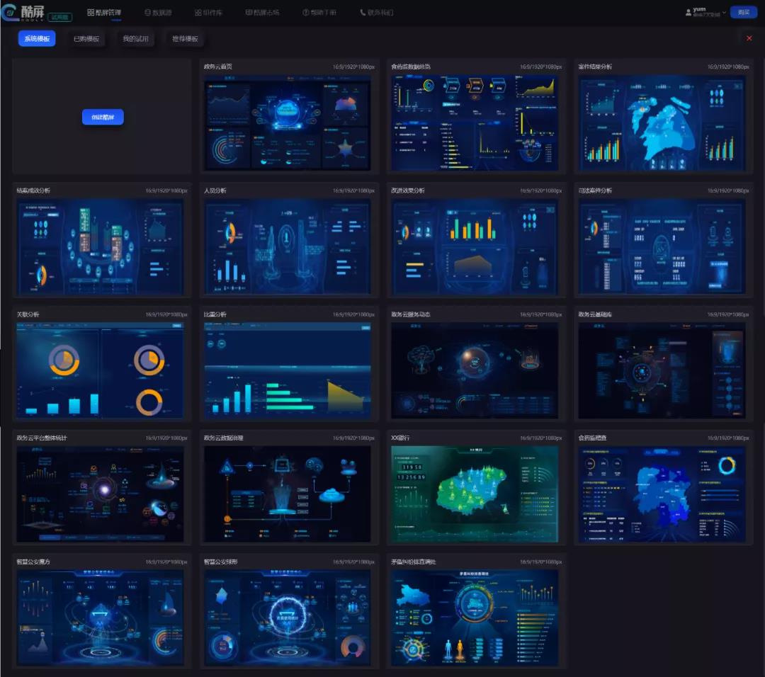 別急,稱得上是可視化領域的種子選手:億信ABI的大屏模塊——酷屏帶著一籮筐解決方法來了,該系統內置18套精美且免費的大屏模板,用戶可一鍵套用,助您快速高效地制作出酷炫大屏。 如果還“不滿足”,咱們酷屏市場還會定期更新時下最酷最IN的模板與組件,用戶可自行試用和購買。今天小億給大家分享酷屏市場中最受歡迎的5套模板,來看看這些“高顏值”模板的應用場景吧,文末有獲取鏈接哦! —TOP 1— 數據管理應用大屏 最佳分辨率:4800*1620 使用場景:精準對接政企的數據治理的可視化需求,利用動態的圖表將數據的流轉狀態清晰展示,明確數據治理的路徑和流程。另外,各個部門的數據資產使用狀況和資源利用率得以清晰地展現,對于管理者來說可以及時并針對性的提出解決方案。 展現邏輯:中心以動畫效果展示數據管理應用的整個流程,實時展示數據接入情況、數據增長趨勢、數據資產概況等信息。